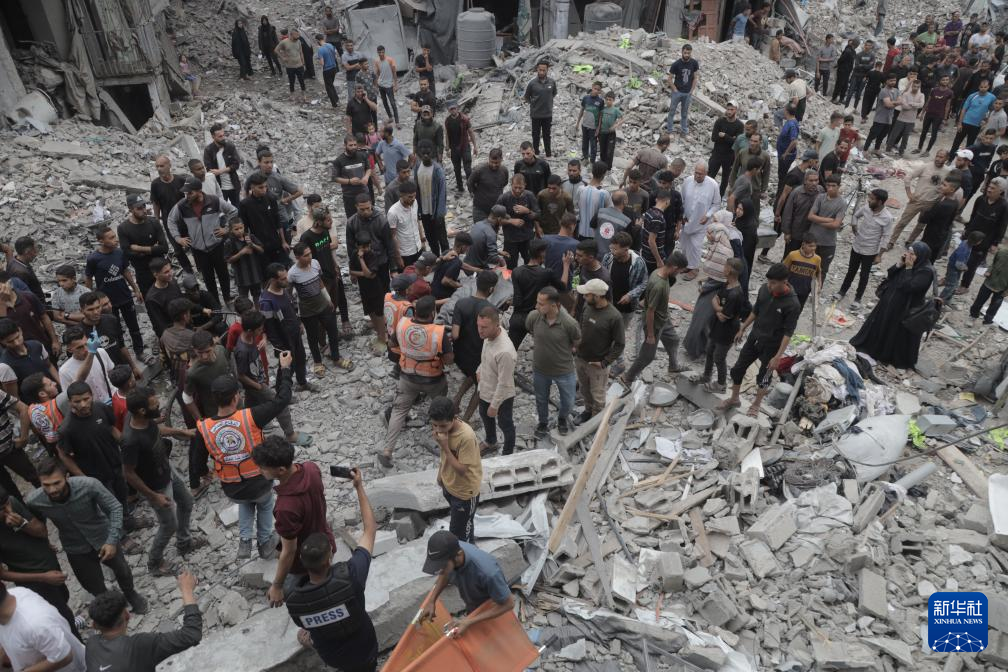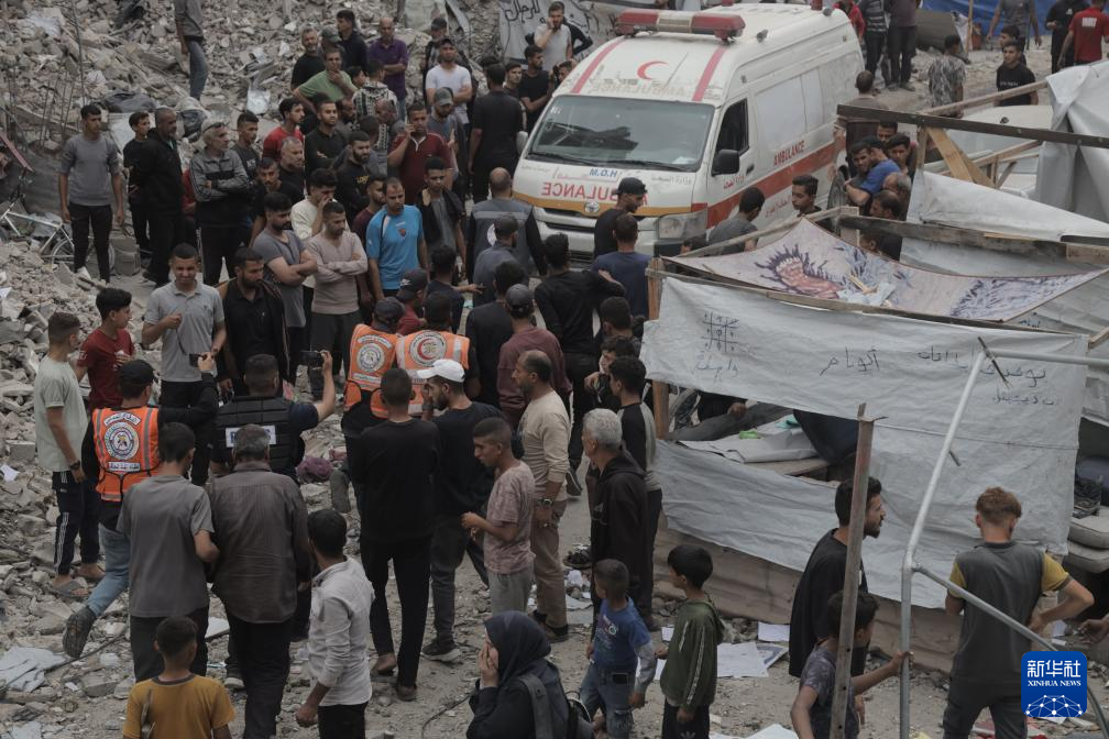 5月15日,在加沙地帶北部杰巴利耶難民營(yíng),人們?cè)谝攒娹Z炸后開展救援。新華社發(fā)(阿卜杜勒·拉赫曼·薩拉馬攝)