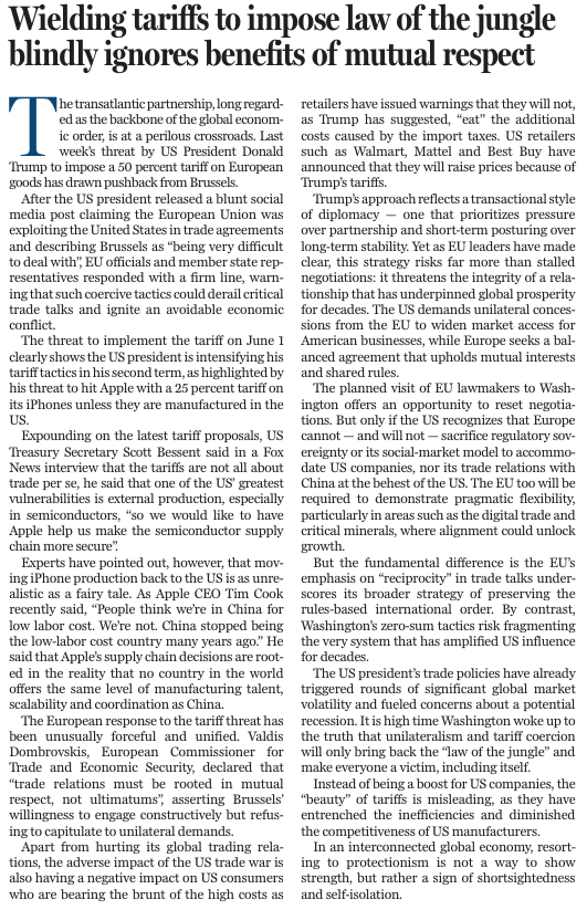 此次,歐盟對(duì)關(guān)稅威脅的回應(yīng)異常有力。歐盟貿(mào)易專員瓦爾迪斯·多姆布羅夫斯基斯明確表示:“貿(mào)易關(guān)系必須根植于相互尊重,而非強(qiáng)制與脅迫”。他同時(shí)強(qiáng)調(diào),歐委會(huì)愿意進(jìn)行建設(shè)性接觸,但絕不向單邊措施屈服。