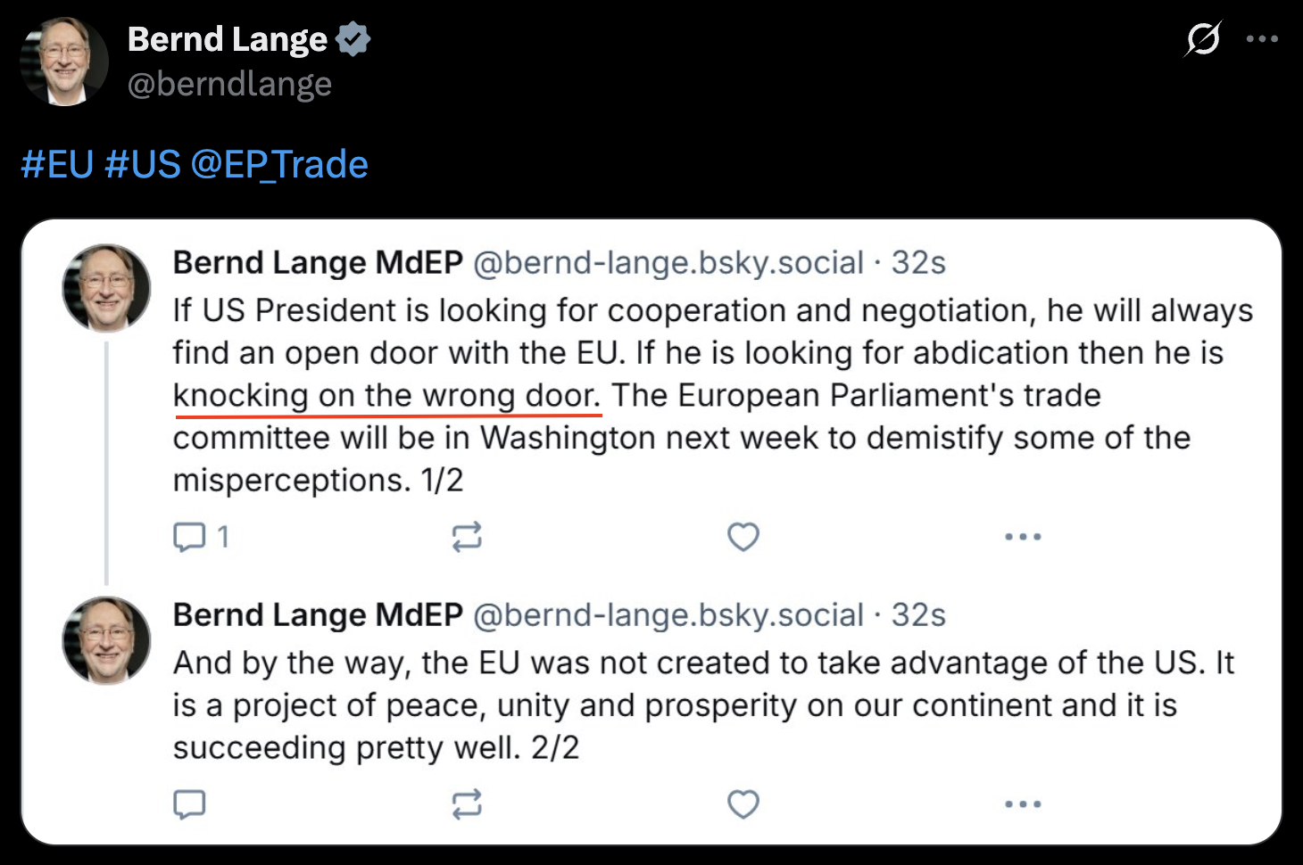 “如果美國尋求合作與談判,歐盟總是愿意敞開大門;但如果只是想讓我們照單全收美方的要求,那它就是敲錯了門。”