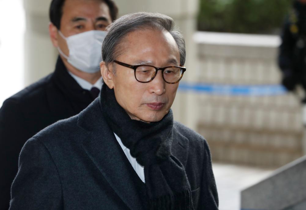 圖為2020年2月19日,李明博(前)抵達(dá)韓國首爾高等法院。新華社/紐西斯通訊社