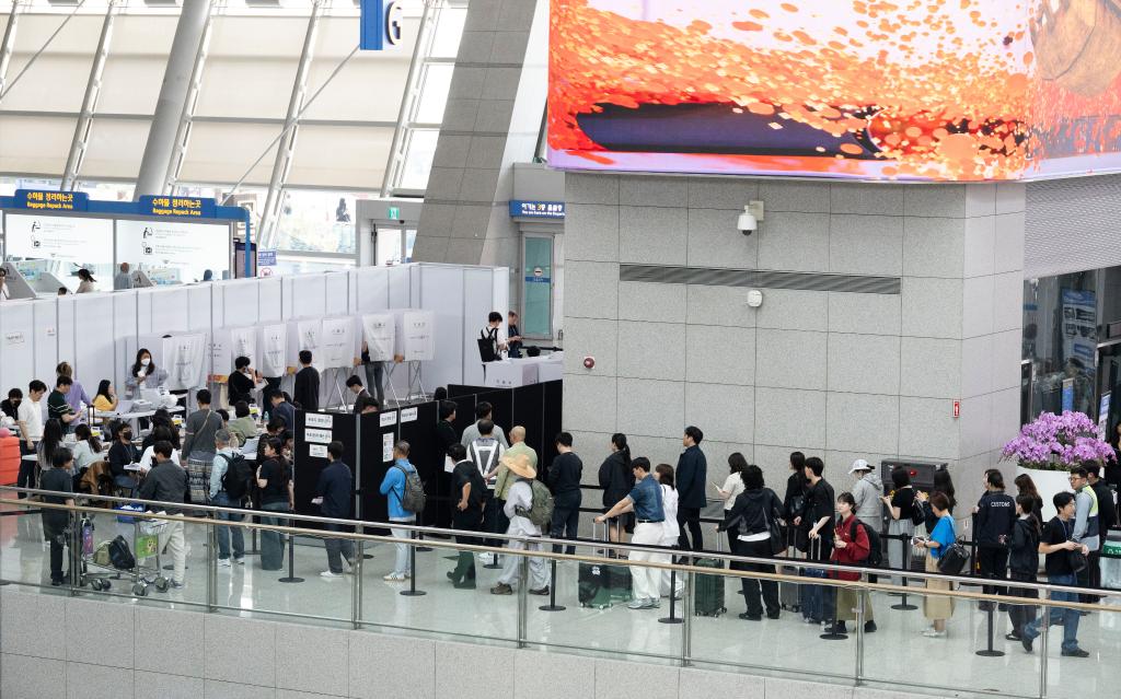 5月29日,選民在韓國仁川機(jī)場的投票站排隊等待投票。新華社發(fā)(全休相攝)