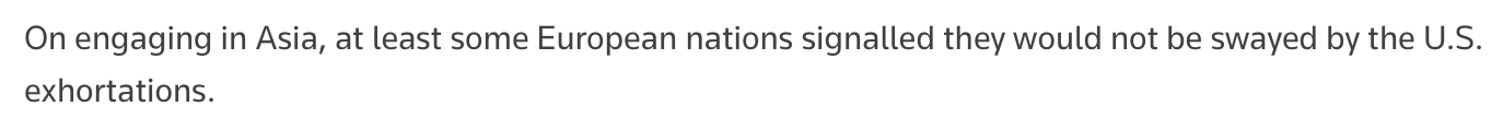文章注意到歐盟外交與安全政策高級代表卡婭·卡拉斯的發(fā)言,稱她似乎將歐盟定位為亞洲富有成效的合作伙伴。她認為,亞洲或許可以成為一種新選擇,以應對美國如今的日益反復無常、奉行保護主義,以及不再重視基于規(guī)則的國際秩序。