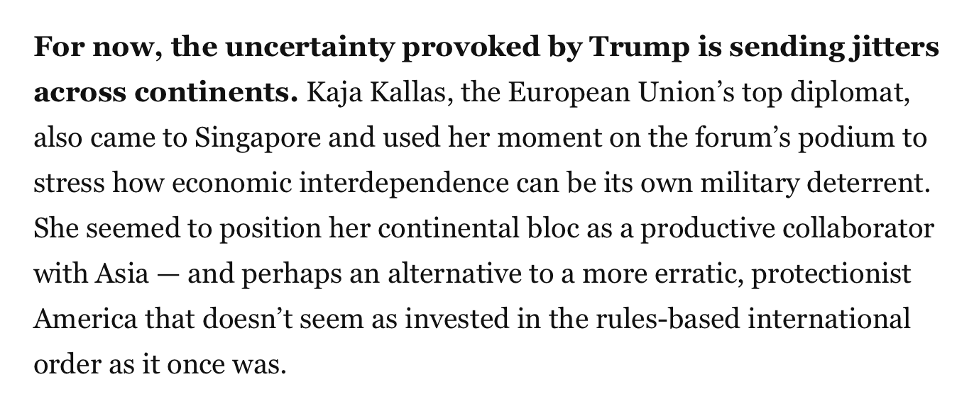 《華盛頓郵報》的一篇文章則通過香格里拉對話會觀察到,美國政府濫施關(guān)稅引發(fā)的不確定性,正讓各大洲陷入不安。