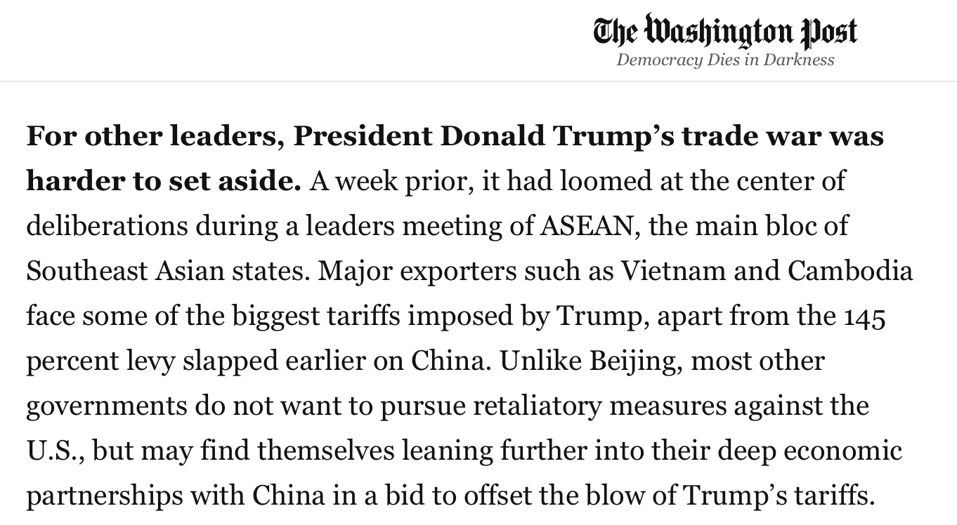 文章說,盡管大多數(shù)亞洲國家的政府沒有對美國采取反制措施,但它們都更傾向于進一步鞏固與中國的深厚經(jīng)濟伙伴關(guān)系,以抵消美國關(guān)稅帶來的沖擊。