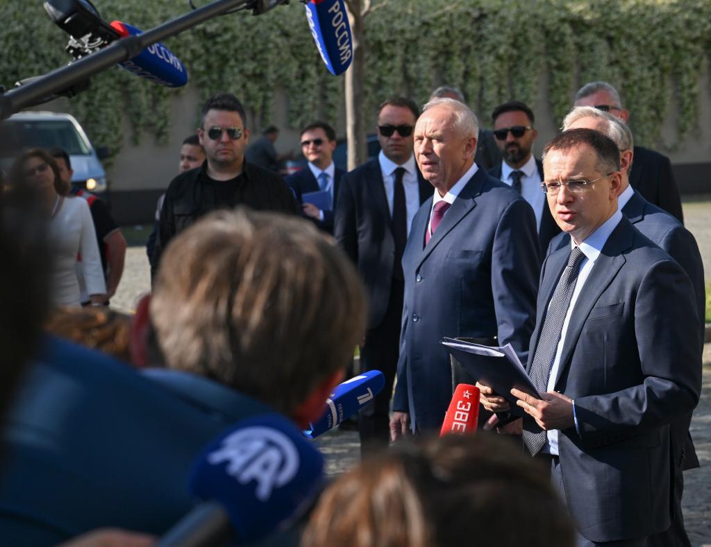 6月2日,在土耳其伊斯坦布爾舉行的俄烏第二輪直接談判結(jié)束后,俄羅斯總統(tǒng)助理、俄方談判代表團團長梅金斯基(右一)向媒體公布談判結(jié)果。新華社記者劉磊攝