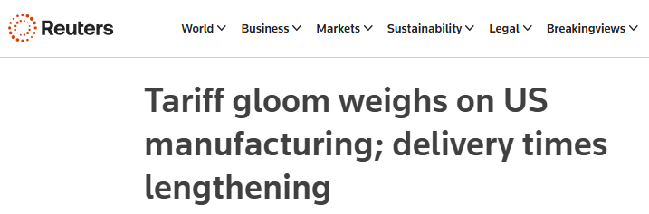 路透社近日的一篇報(bào)道認(rèn)為,美國制造業(yè)5月連續(xù)第三個(gè)月萎縮,在關(guān)稅影響下,供應(yīng)商交付投入的時(shí)間是近三年來最長的,這可能預(yù)示著某些商品即將出現(xiàn)短缺。