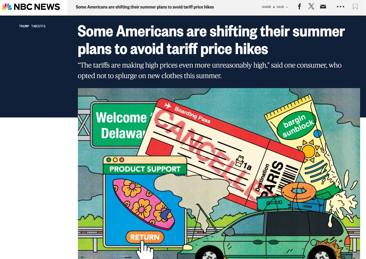 對(duì)于美國普通消費(fèi)者而言,關(guān)稅也讓他們今年的夏天和往年有所不同。美國全國廣播公司網(wǎng)站近日的一篇文章說,美國政府的關(guān)稅政策,讓美國消費(fèi)者對(duì)自身成本的擔(dān)憂持續(xù)加劇,他們不得不減少休閑活動(dòng)和購物狂歡。