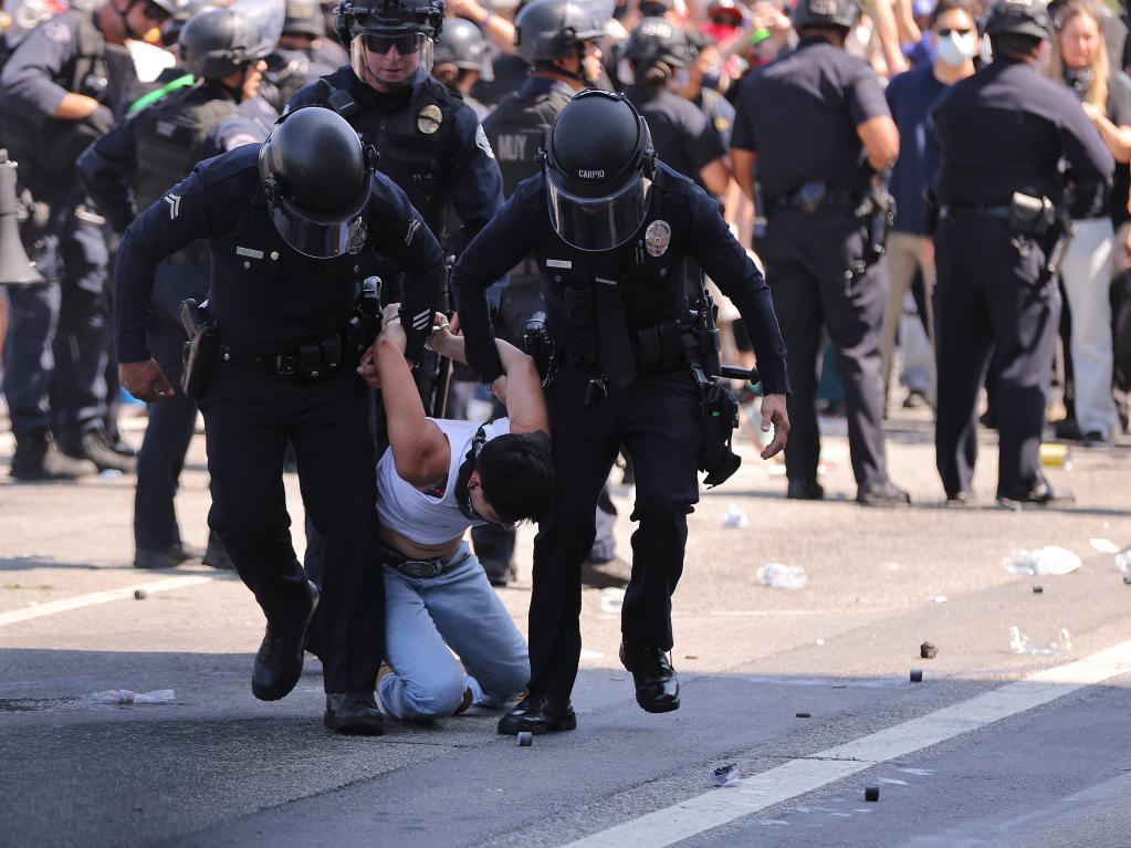 6月8日,在美國加利福尼亞州洛杉磯市中心的聯(lián)邦執(zhí)法機構(gòu)門前,一名抗議者被警察控制。新華社發(fā)(邱晨攝)
