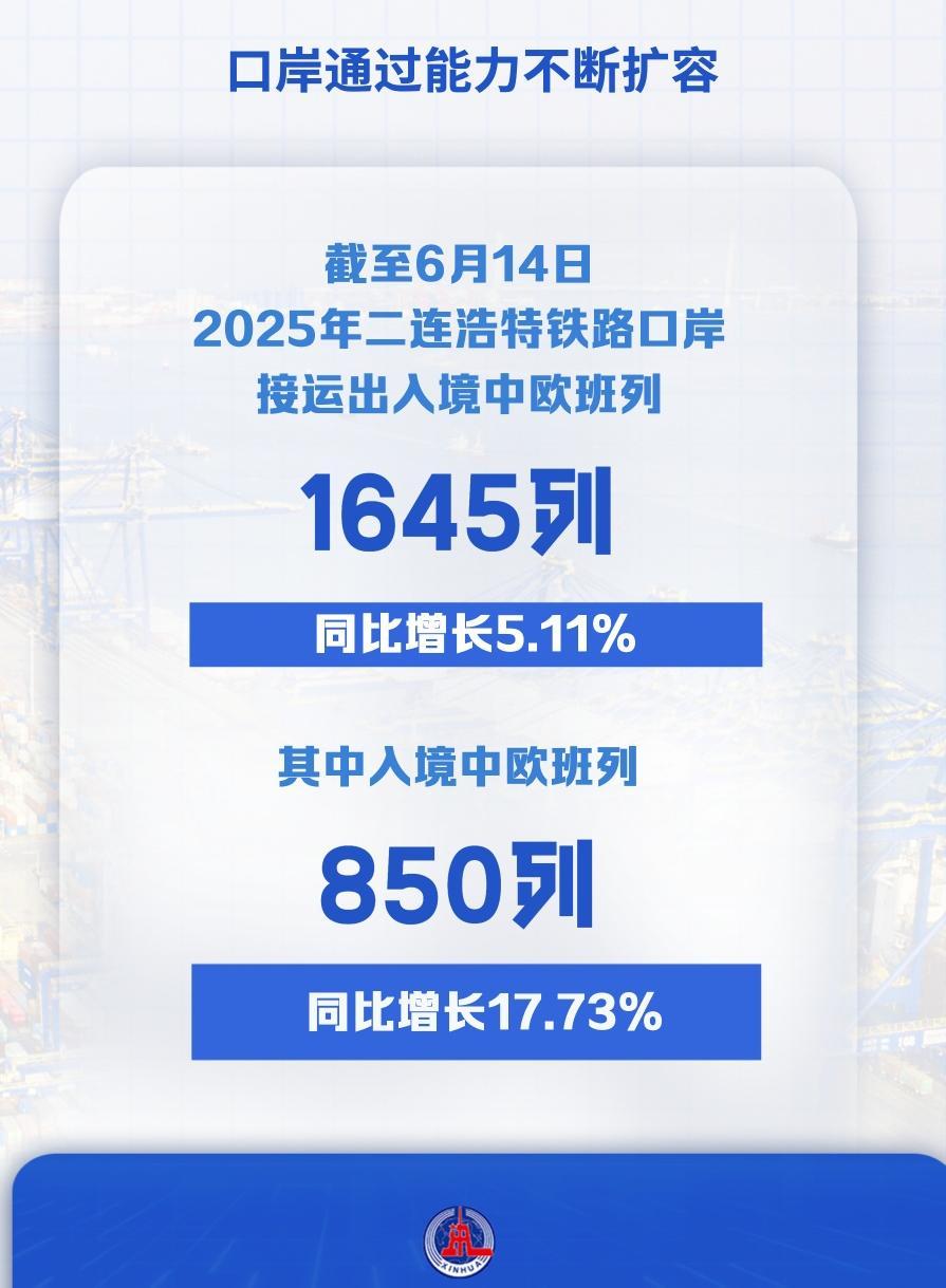 二連浩特口岸是中歐班列中通道進(jìn)出境的唯一鐵路口岸,截至6月14日,2025年二連浩特鐵路口岸接運(yùn)出入境中歐班列1645列,同比增長(zhǎng)5.11%,其中入境中歐班列850列,同比增長(zhǎng)17.73%。
