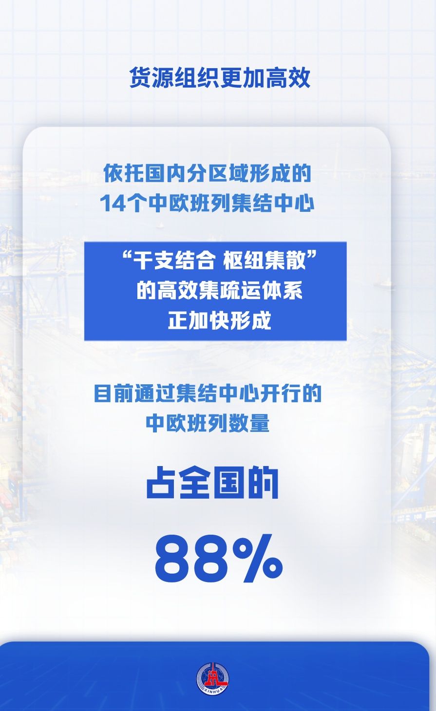 依托國(guó)內(nèi)分區(qū)域形成的14個(gè)中歐班列集結(jié)中心,“干支結(jié)合、樞紐集散”的高效集疏運(yùn)體系正加快形成,目前通過(guò)集結(jié)中心開(kāi)行的中歐班列數(shù)量占全國(guó)的88%。