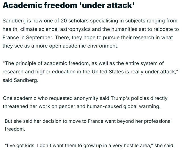 還有一位女學(xué)者告訴媒體,美國(guó)現(xiàn)政府的政策直接威脅到她有關(guān)氣候變暖等方面的研究工作,她搬到法國(guó)不僅是為了學(xué)術(shù)自由,還是因?yàn)椴幌胱屪约旱暮⒆印霸谝粋€(gè)充滿(mǎn)敵意的地方長(zhǎng)大”。