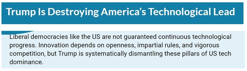 文章稱(chēng),研究機(jī)構(gòu)、人才、資金等一直是支撐美國(guó)創(chuàng)新發(fā)展的重要支柱,而美國(guó)現(xiàn)政府正在系統(tǒng)性地拆除這些支柱,斷送自己的科技領(lǐng)先地位。