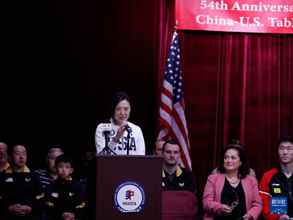 7月13日,美國乒協(xié)首席執(zhí)行官沈偉妮在美國內(nèi)華達(dá)州拉斯維加斯舉辦的紀(jì)念中美“乒乓外交”54周年暨中美乒乓球友好交流活動(dòng)上致辭。新華社發(fā)(邱晨攝)