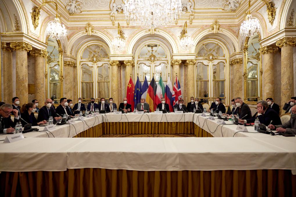 這是2021年12月27日在奧地利維也納拍攝的伊朗核問題全面協(xié)議聯(lián)合委員會政治總司長級會議現(xiàn)場。新華社發(fā)(歐盟駐維也納代表團供圖)