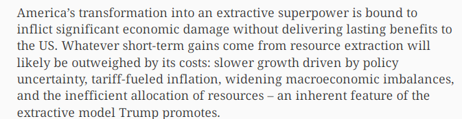 文章認(rèn)為,美國向資源掠奪型超級大國的蛻變,注定將無法為美國帶來持久利益,反而還會給美國自身造成重大經(jīng)濟(jì)損害。資源掠奪帶來的任何短期收益,都可能被以下代價抵消:政策不確定性導(dǎo)致的增長放緩、關(guān)稅推高的通貨膨脹、日益擴(kuò)大的宏觀經(jīng)濟(jì)失衡,以及資源配置的低效——這些正是掠奪模式與生俱來的缺陷。