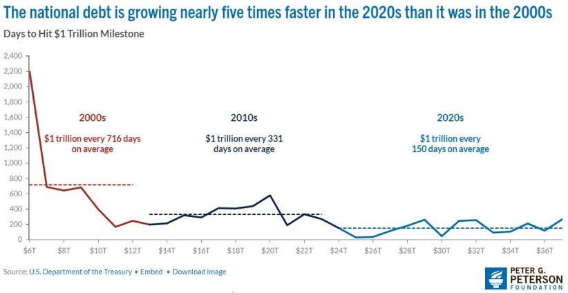 據(jù)其統(tǒng)計(jì),在本世紀(jì)第一個(gè)十年,美債每增加1萬億美元平均需要近兩年(716天);在本世紀(jì)第二個(gè)十年,這一時(shí)間縮短到了不到一年(331天);而到了目前所處的本世紀(jì)第三個(gè)十年,美債平均不到半年(150天)就會跨越一個(gè)萬億美元級大關(guān)。
