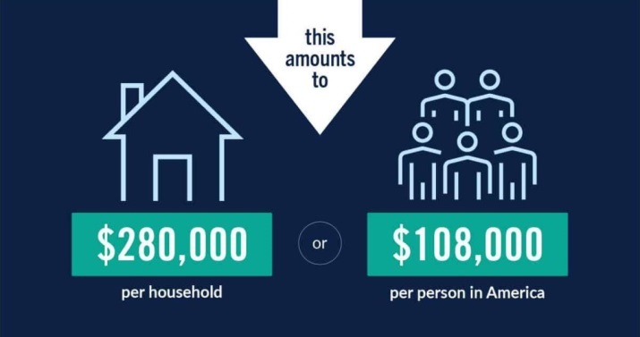 彼得森基金會給出驚人結(jié)果:如果將債務(wù)分?jǐn)偨o美國民眾,相當(dāng)于每戶家庭負(fù)債28萬美元,每個(gè)人負(fù)債10.8萬美元。