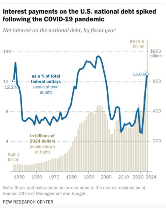 隨著債臺越筑越高,美國政府2024財(cái)年支付的凈債息已達(dá)到8799億美元,占當(dāng)年財(cái)政總支出的13%,不僅創(chuàng)下25年來的最高比例,而且超過了醫(yī)保支出(8741億美元)和軍費(fèi)支出(8735億美元)。