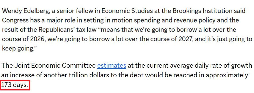 據(jù)美國國會聯(lián)合經(jīng)濟(jì)委員會估計(jì),按照目前的日均增長速度,美債總額將在大約173天內(nèi)再增加1萬億美元。