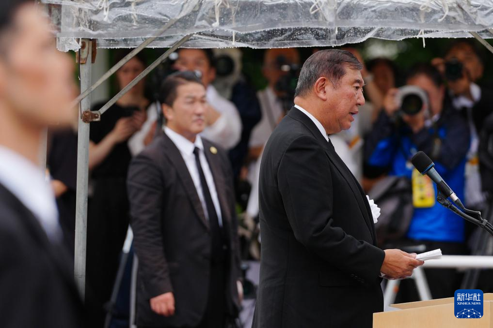 8月9日,日本首相石破茂在長崎舉行的遭原子彈轟炸紀念儀式上發(fā)言。新華社記者 賈浩成 攝