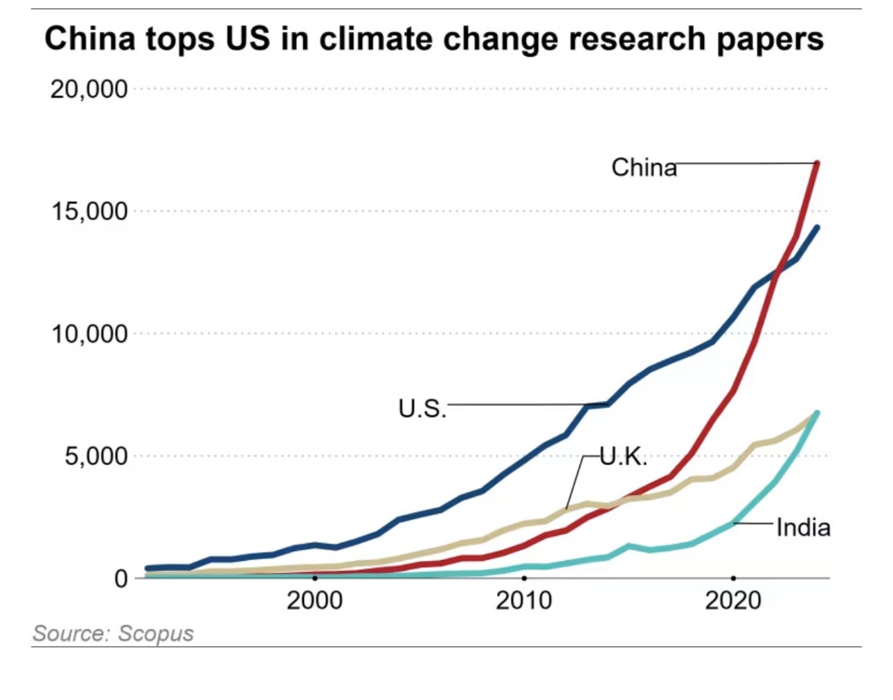 《日經(jīng)亞洲評(píng)論》22日發(fā)布的一篇文章指出,中國在2023年發(fā)表的氣候變化研究論文數(shù)量超過了美國,并在次年擴(kuò)大了領(lǐng)先優(yōu)勢(shì)。這一趨勢(shì)凸顯了中國全球影響力的持續(xù)增長(zhǎng),與此同時(shí),美國卻在逐漸退出這一領(lǐng)域。