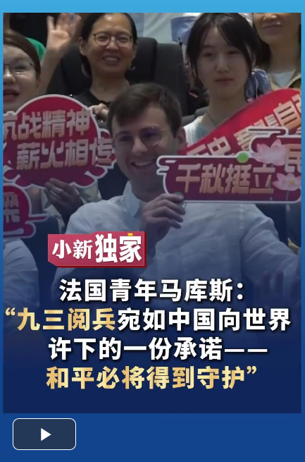 9月3日,法國青年馬庫斯在北京一家電影院通過4K超高清大熒幕觀看了紀(jì)念中國人民抗日戰(zhàn)爭暨世界反法西斯戰(zhàn)爭勝利80周年大會(huì)的電視直播。直播結(jié)束后,馬庫斯在接受中新社記者采訪時(shí)表示,整個(gè)閱兵活動(dòng)給他留下了極為深刻的印象,它宛如一份向世界許下的承諾——和平必將得到守護(hù)。(謝龍飛 何凌霄 視頻制作 田敏娜)