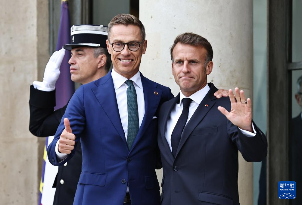 9月4日,在法國(guó)首都巴黎的總統(tǒng)府愛(ài)麗舍宮,法國(guó)總統(tǒng)馬克龍(右)迎接出席“志愿聯(lián)盟”線上會(huì)議的芬蘭總統(tǒng)斯圖布。新華社記者 高靜 攝