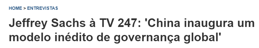 巴西247新聞網近日刊登一篇文章,介紹了世界知名學者杰弗里·薩克斯接受巴西247電視臺專訪時,對中國提出的全球治理倡議予以高度評價。他認為,“中國開創(chuàng)了前所未有的全球治理模式”。