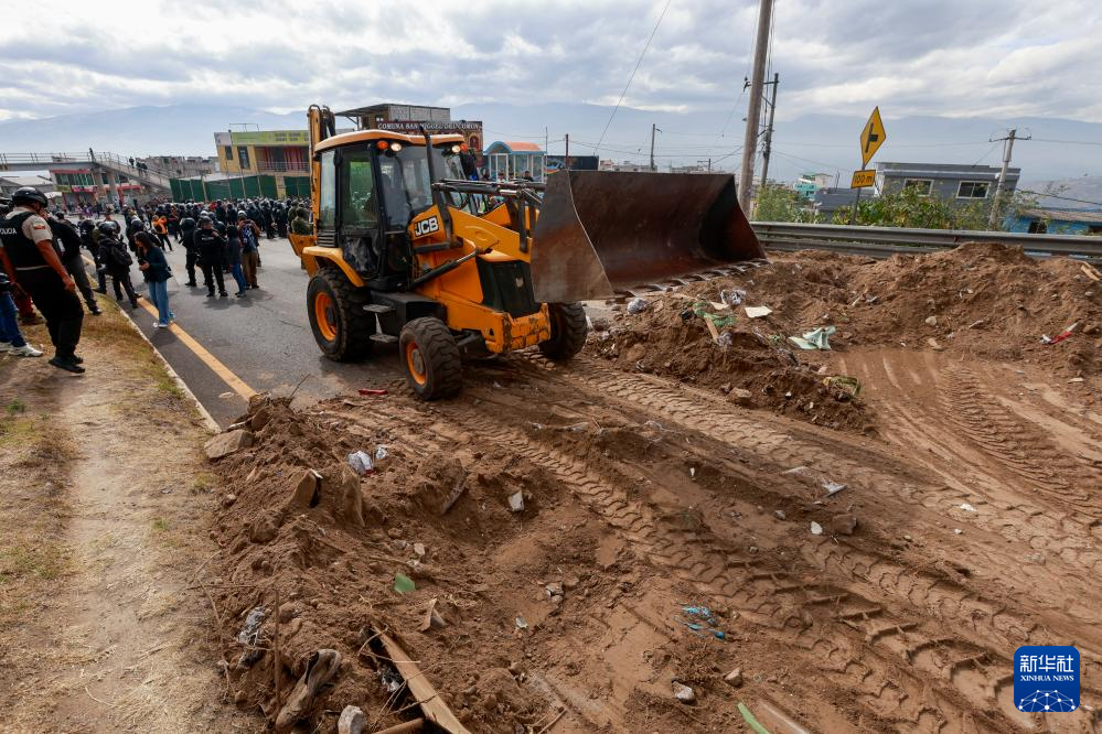 9月16日,在厄瓜多爾首都基多,一輛推土機在清理示威者設(shè)置的路障。新華社發(fā)(里卡多·蘭德塔攝)