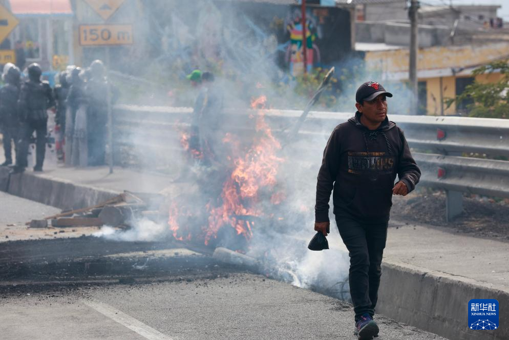 9月16日,在厄瓜多爾首都基多,一名路人經(jīng)過示威者點燃的路障。新華社發(fā)(里卡多·蘭德塔攝)