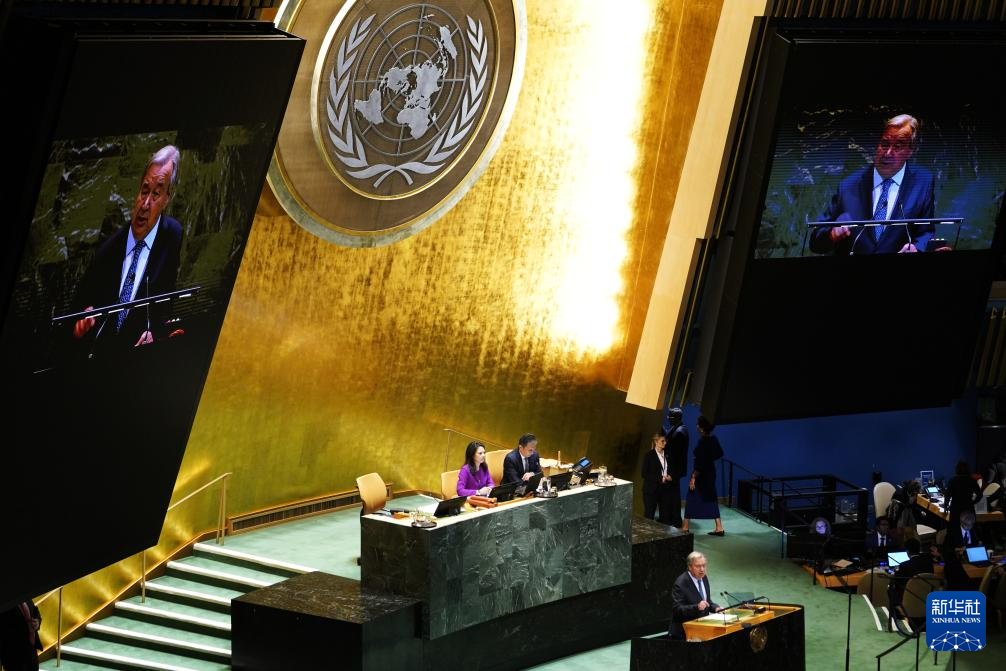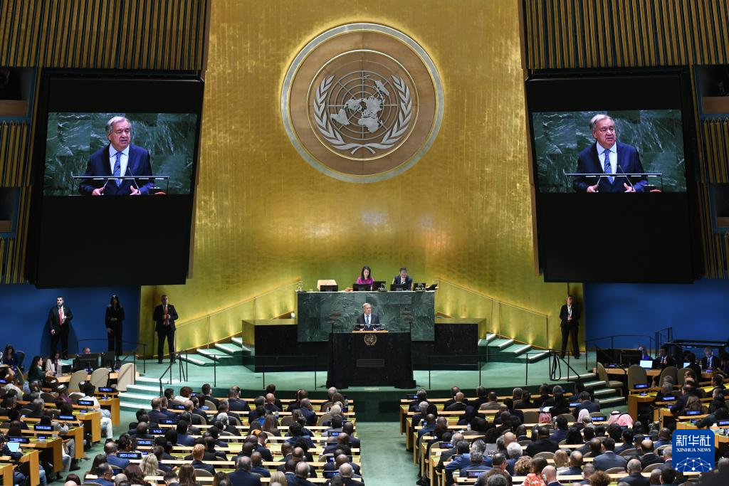 9月23日,在位于紐約的聯(lián)合國(guó)總部,聯(lián)合國(guó)秘書長(zhǎng)古特雷斯在第80屆聯(lián)合國(guó)大會(huì)一般性辯論開(kāi)幕式上致辭。新華社記者李睿攝