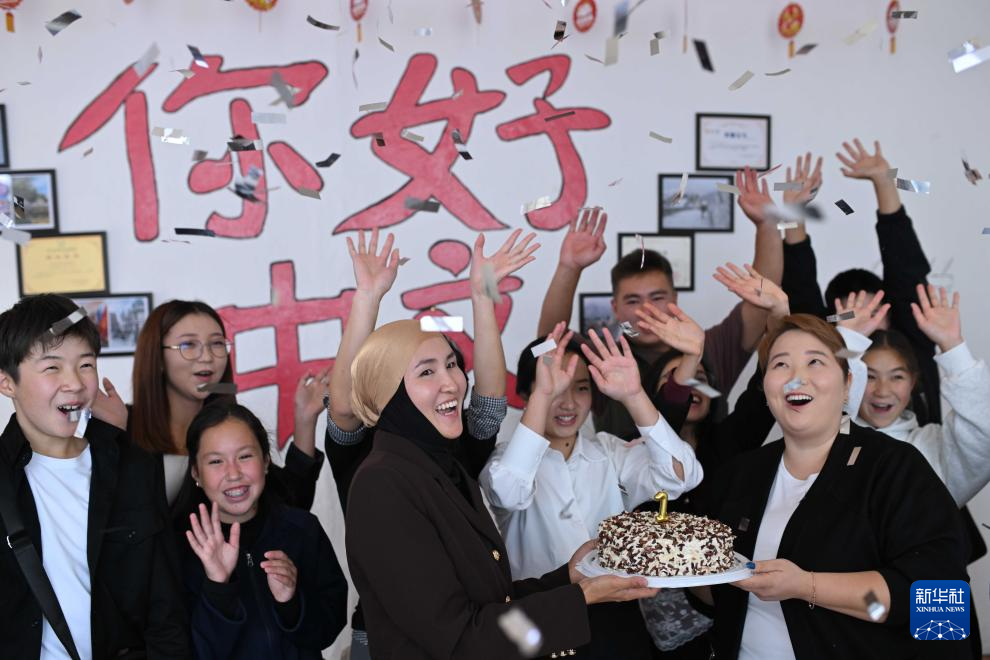 9月22日,在吉爾吉斯斯坦伊塞克湖州卡拉庫爾市,庫巴內(nèi)奇別科娃(前右)和同事、學(xué)生們共同慶祝中文培訓(xùn)中心成立一周年。新華社記者 李任滋 攝