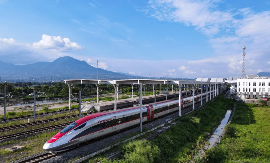 5月20日,在印度尼西亞萬(wàn)隆,一列雅萬(wàn)高鐵高速動(dòng)車組列車駛出德卡魯爾站(無(wú)人機(jī)照片)。新華社記者 徐欽 攝