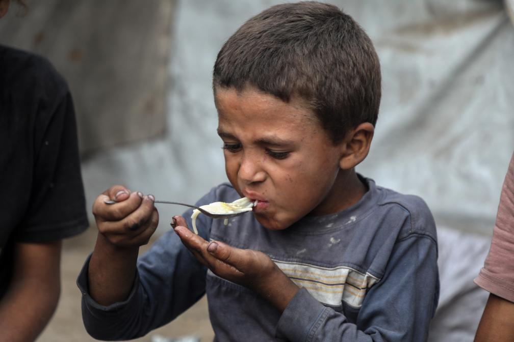 2025年7月29日,在加沙城的一個帳篷里,一名男孩在進食。當?shù)卦S多家庭僅靠少許入境加沙地帶的人道主義援助物資維系生存。新華社發(fā)(里澤克·阿卜杜勒賈瓦德攝)