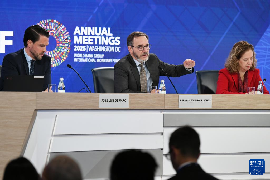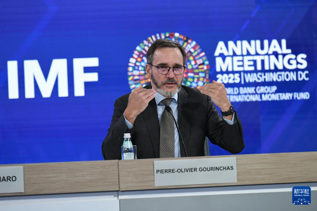 10月14日,在美國(guó)華盛頓,國(guó)際貨幣基金組織首席經(jīng)濟(jì)學(xué)家皮埃爾-奧利維耶·古蘭沙(中)在《世界經(jīng)濟(jì)展望報(bào)告》新聞發(fā)布會(huì)上講話。新華社記者 李睿 攝