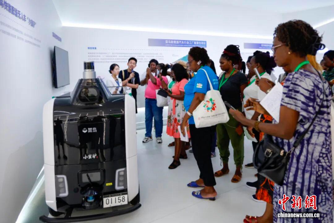 2025年9月16日,中非婦女官員能力建設(shè)研修班的25名學(xué)員來到杭州的中國人工智能小鎮(zhèn)。圖為研修班成員參觀快遞配送無人車。 中新社記者 肖健 攝