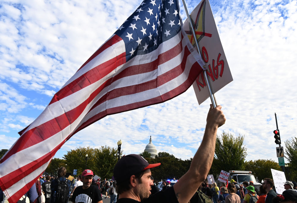 10月18日,在美國華盛頓,人們參加示威游行活動(dòng)。新華社記者李睿攝