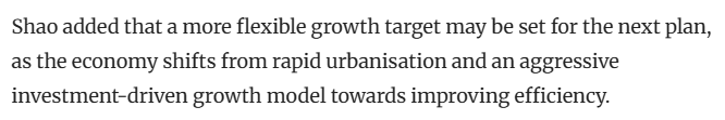 《南華早報》援引分析人士的表述認為,隨著中國經(jīng)濟從快速城鎮(zhèn)化和投資驅(qū)動型增長模式轉(zhuǎn)向高質(zhì)量發(fā)展,中國下一個五年規(guī)劃可能會設(shè)定更靈活的增長目標(biāo)。