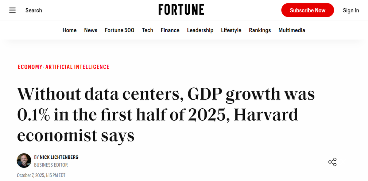 2025年上半年,美國GDP增長幾乎全部依賴數(shù)據(jù)中心和AI投資,其中AI投資占比近92%。哈佛大學(xué)經(jīng)濟(jì)學(xué)家杰森·弗曼指出,若剔除這一領(lǐng)域,其余產(chǎn)業(yè)合計成長率僅0.1%,幾乎陷入停滯。