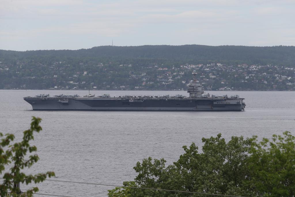 2023年5月24日,美國(guó)“杰拉爾德·R·福特”級(jí)航空母艦首艦“福特”號(hào)??吭谂餐锥紛W斯陸的峽灣中。新華社記者張玉亮攝