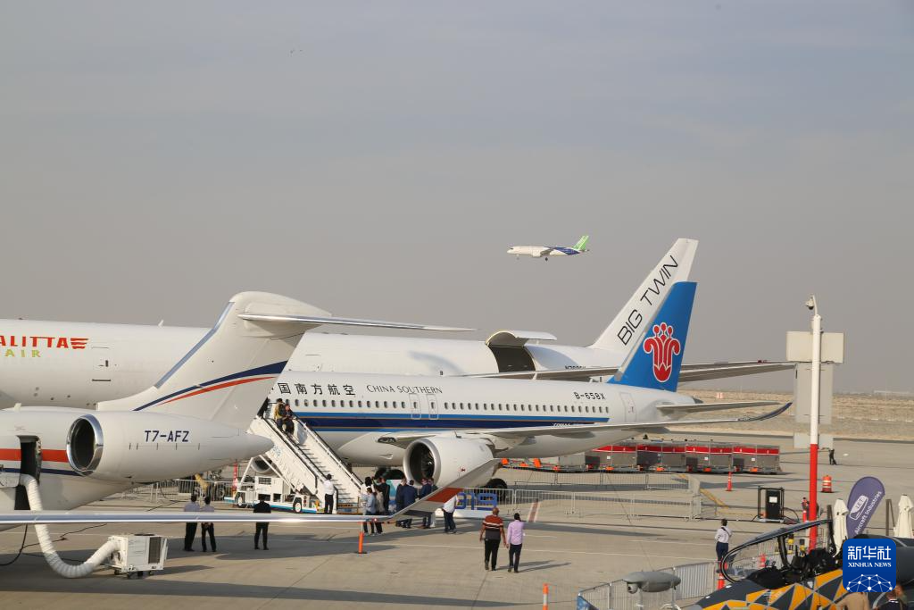 11月17日,在阿聯(lián)酋迪拜,中國(guó)商飛的C919飛機(jī)進(jìn)行飛行展示,地面上停著的是中國(guó)南航的C919飛機(jī)。新華社記者 溫新年 攝