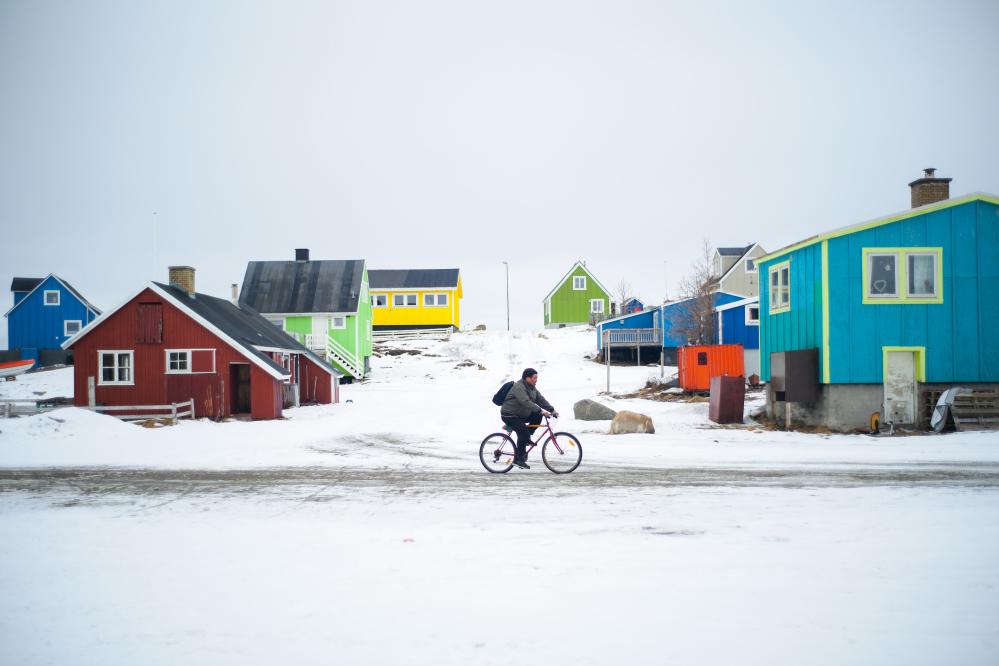 3月22日,在丹麥自治領地格陵蘭島納爾薩克,一名男子在街道上騎行。新華社記者彭子洋攝
