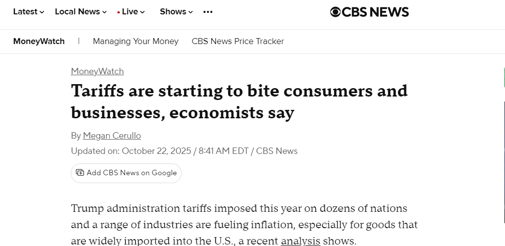 哥倫比亞廣播公司(CBS)新聞網(wǎng)今年10月的報道也指出,美國政府實施的關(guān)稅開始“咬噬”消費者和企業(yè)。經(jīng)濟學(xué)家指出,關(guān)稅正在推高通脹,尤其是對大量進口的商品而言。進口商通常會將部分關(guān)稅成本轉(zhuǎn)嫁給消費者。今年關(guān)稅預(yù)計將給美國企業(yè)額外增加1.2萬億美元成本,其中大部分由消費者承擔。
