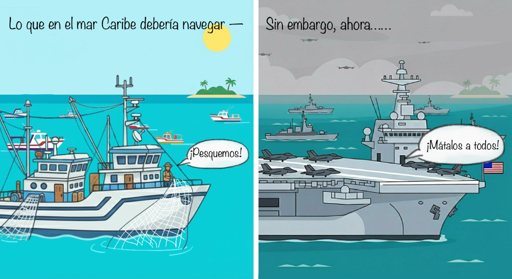 漫畫《“加勒比海盜”》。畫面左側,航行在加勒比海上的本該是收獲滿滿的漁船。但在畫面右側,現(xiàn)如今的加勒比海陰云密布、軍艦成群,回蕩著美軍“不留活口”的口號。