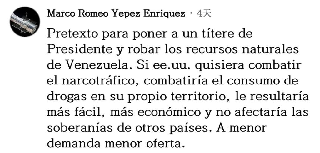 網(wǎng)友馬爾科·耶佩斯直言不諱:“所有一切不過是美國安插傀儡以掠奪委內瑞拉自然資源的借口罷了。如果美國真想打擊販毒,就應該去打擊自己領土上的毒品消費,這樣更簡單、更經(jīng)濟,也不會影響其他國家的主權,需求減少供應自然也會下降?!?/p>