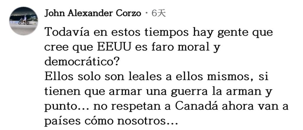 網(wǎng)友約翰·科爾索坦言道:“時至今日,還有人相信美國是道德和民主的燈塔嗎?他們只忠于自己,如果需要發(fā)動一場戰(zhàn)爭,他們隨時會發(fā)動,僅此而已!他們連加拿大都不尊重,現(xiàn)在矛頭對準我們這樣的國家了。”