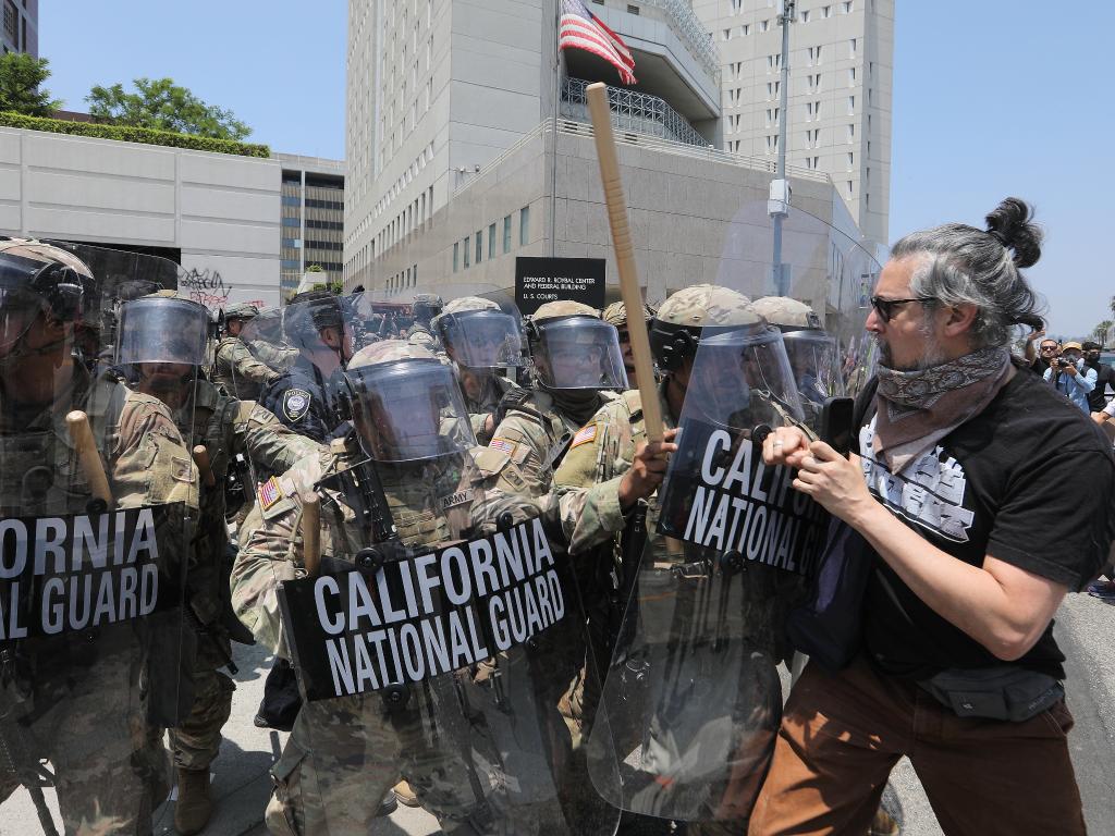 2025年6月8日,在美國加利福尼亞州洛杉磯市中心的聯(lián)邦執(zhí)法機(jī)構(gòu)門前,抗議者與國民警衛(wèi)隊(duì)人員發(fā)生沖突。新華社發(fā)(邱晨攝)