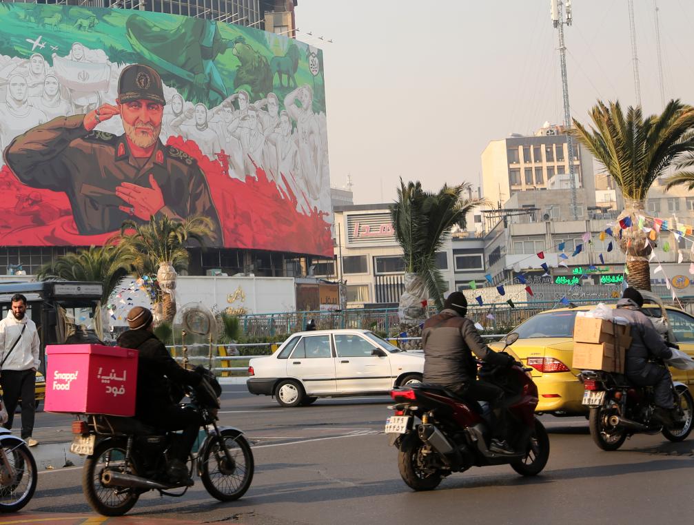 2026年1月6日,在伊朗首都德黑蘭街頭,車輛經(jīng)過一幅繪有伊遇襲身亡的高級將領(lǐng)卡西姆·蘇萊曼尼形象的宣傳海報。新華社發(fā)
