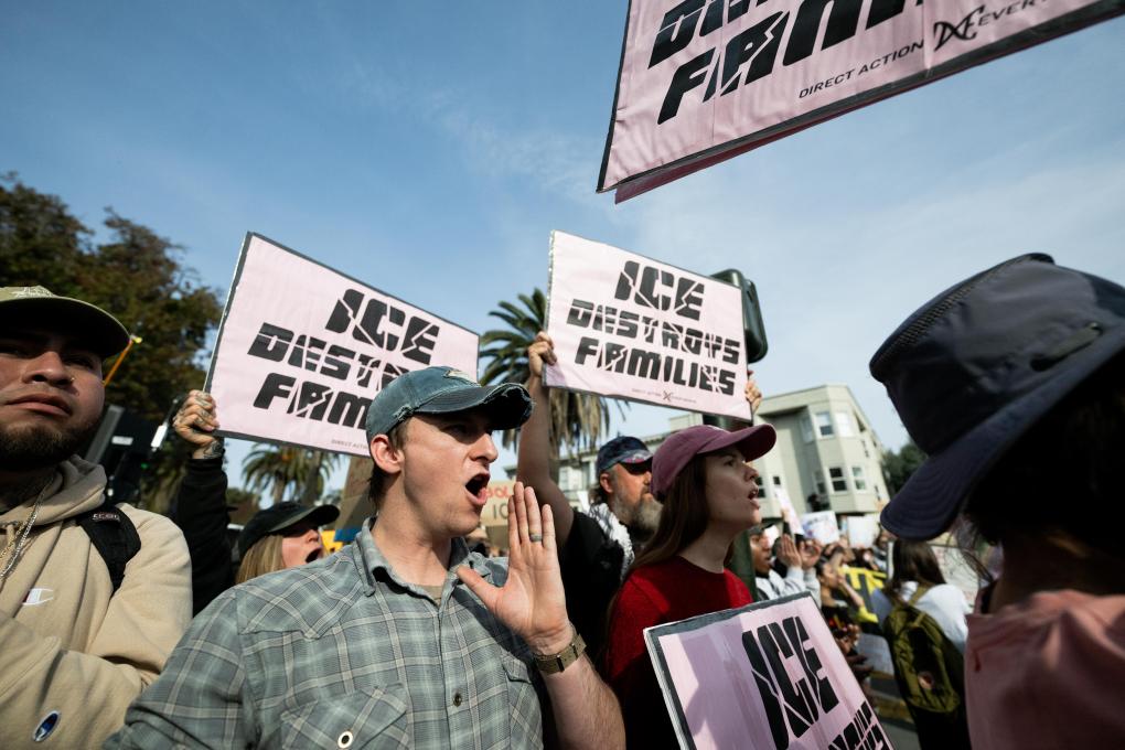 2026年1月30日,人們?cè)诿绹永D醽喼菖f金山參加示威游行,抗議特朗普政府暴力移民執(zhí)法。新華社發(fā)(朱子于攝)