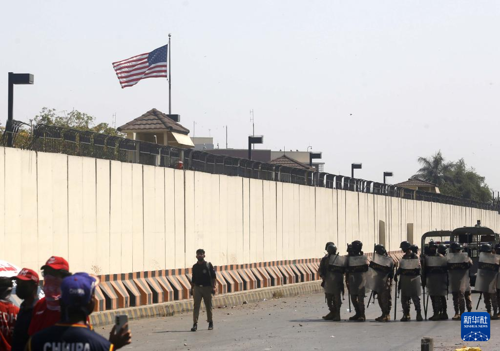 3月1日,執(zhí)法人員在巴基斯坦南部城市卡拉奇的美國(guó)駐卡拉奇領(lǐng)事館外控制局勢(shì)。新華社發(fā)(伊姆蘭·阿里攝)